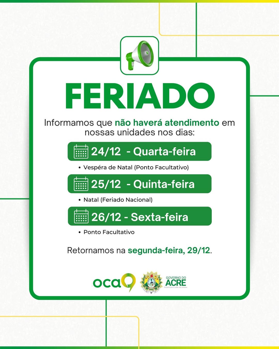 As unidades da Organização em Centros de Atendimento (OCA) também não funcionarão durante esse período. Conforme comunicado, não haverá atendimento ao público nos dias 24, 25 e 26 de dezembro, com retorno das atividades na segunda-feira (29).