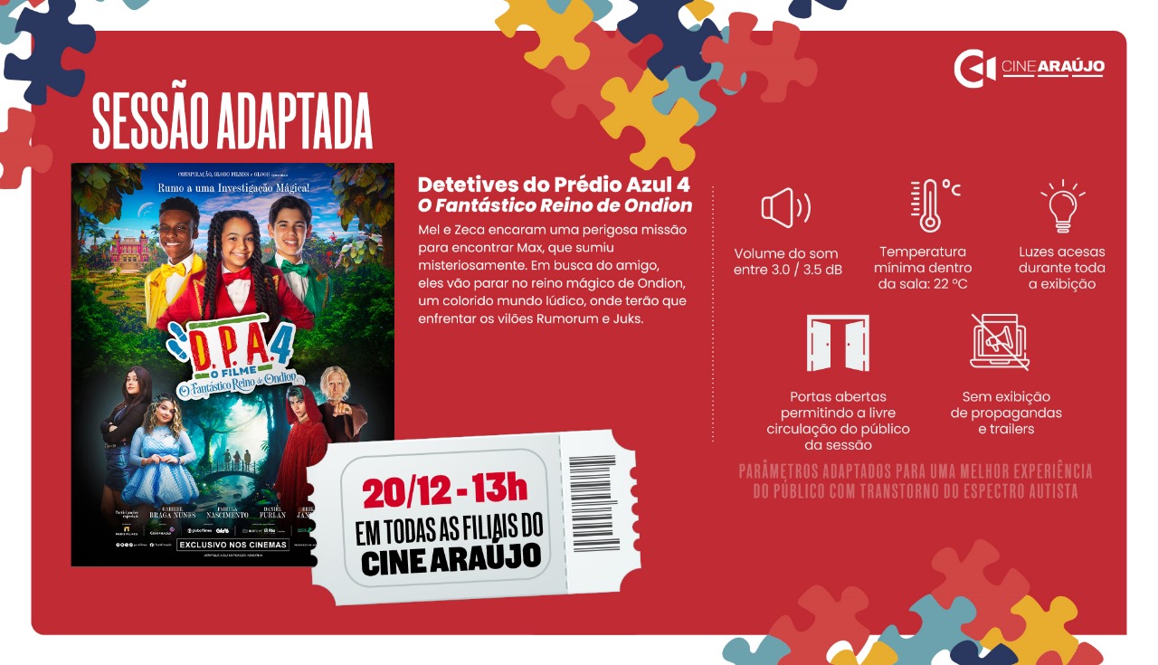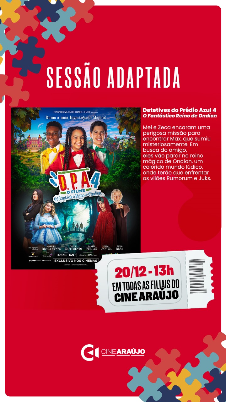 O espírito natalino também chega às telonas do Via Verde Shopping com uma programação pensada para acolher, incluir e emocionar. No dia 20 de dezembro, às 13h, o Cine Araújo realiza mais uma Sessão Adaptada, desta vez com a exibição do filme “Detetives do Prédio Azul 4: O Fantástico Reino de Ondion”.