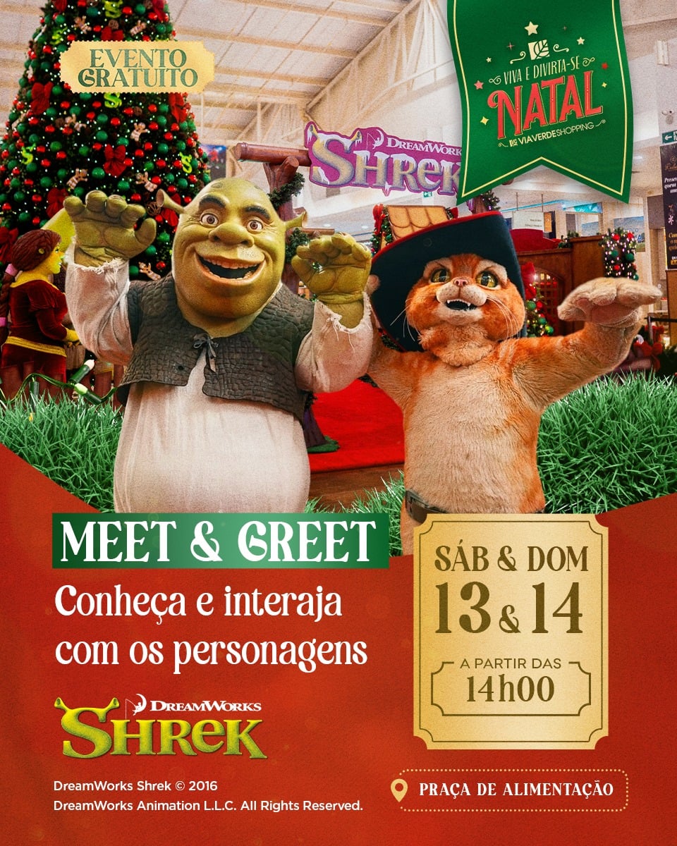 O Via Verde Shopping convida o público a viver a magia do Natal em uma experiência divertida, acolhedora e repleta de fantasia ao lado de Shrek e Gato de Botas.