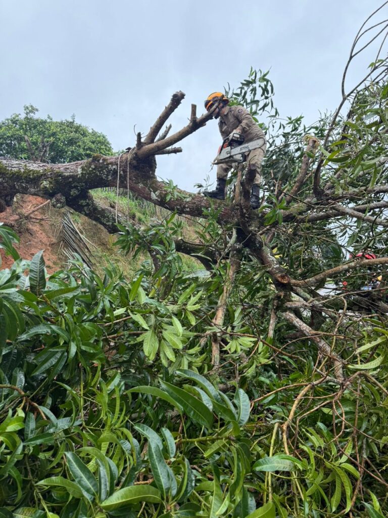 Na segunda ocorrência, uma ingazeira tombou sobre um muro. A área foi isolada e a árvore parcialmente tratada, mas o corte total não pôde ser feito, já que parte da estrutura atingiu a rede elétrica. O proprietário foi orientado a acionar a concessionária para o desligamento seguro da energia. A guarnição deve retornar na manhã desta terça-feira (9) para concluir a remoção.