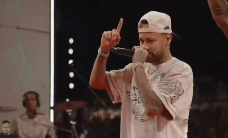Neymar Jr. está aproveitando as férias, em São Paulo, após ajudar na campanha que evitou o rebaixamento do Santos no Campeonato Brasileiro. Neste sábado (20), ele participou do show “Tardezinha”, do cantor Thiaguinho.