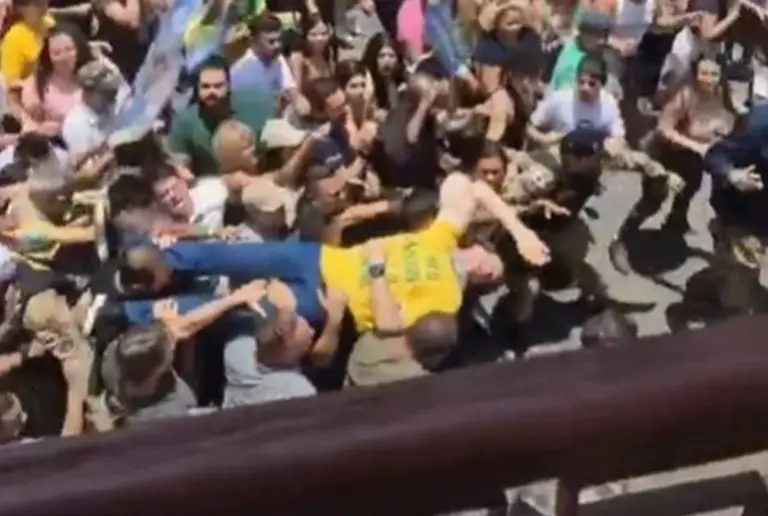 As imagens, gravadas por pessoas que estavam no local, mostram a reconstituição detalhada da multidão e do instante em que o então candidato é ferido. Em outra tomada, o ator aparece sendo carregado por apoiadores e conduzido às pressas para atendimento, repetindo a cena amplamente divulgada na época.