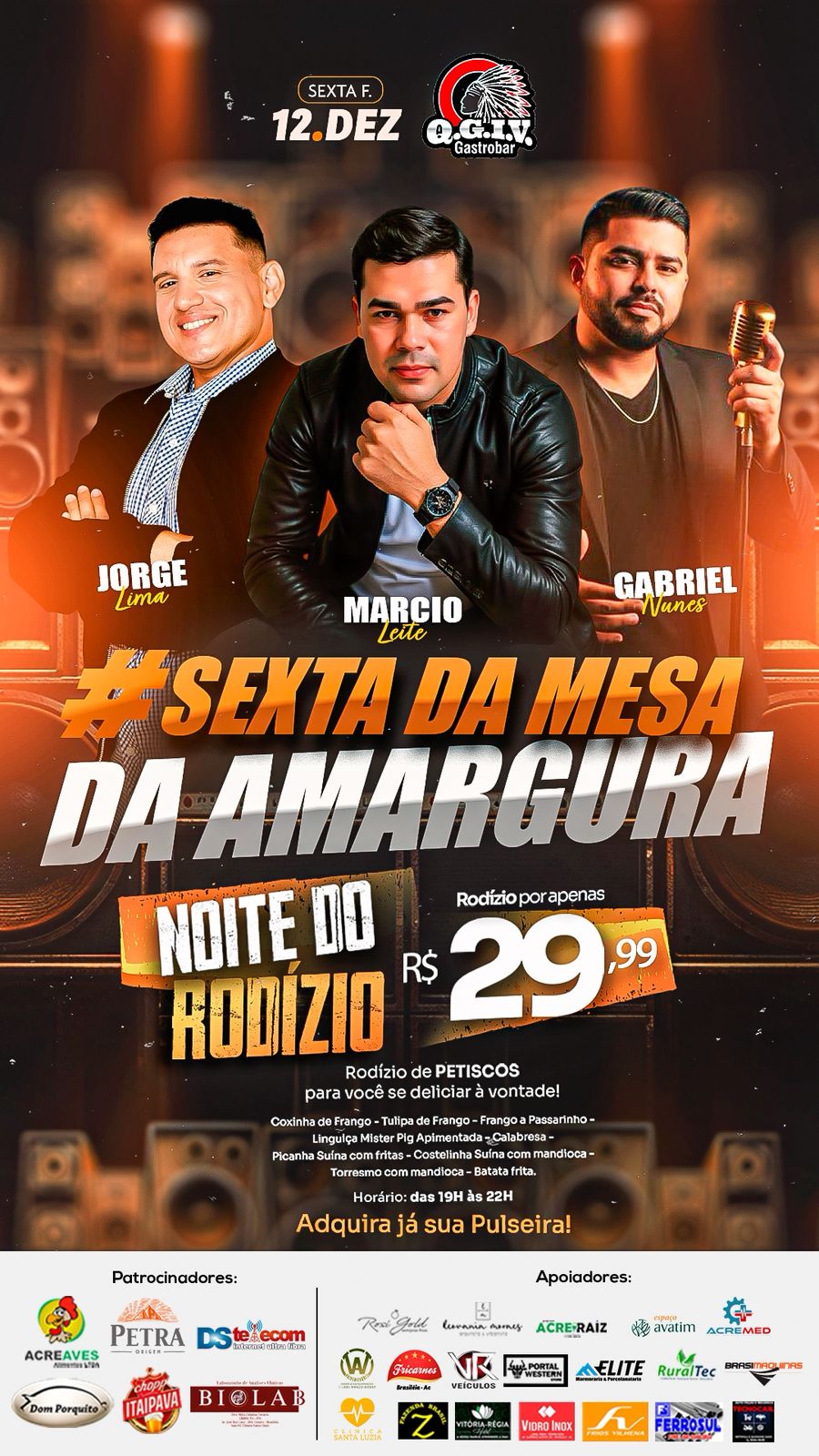 O Q.G.I.V Gastrobar prepara uma noite daquelas para marcar a agenda cultural desta sexta-feira, 12 de dezembro, com a já conhecida e aguardada “Sexta da Mesa da Amargura”. A casa recebe três grandes nomes da música local, Jorge Lima, Márcio Leite e Gabriel Nunes, que irão comandar o palco e garantir um repertório variado e cheio de emoção.