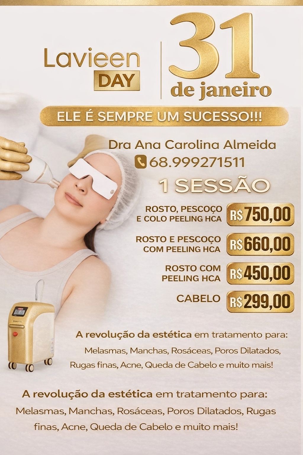 Já é sábado 31 de janeiro o Lavieen Day na clínica da Dra. Ana Carolina. Um dia especial dedicado a quem busca mais saúde, viço e rejuvenescimento da pele com tecnologia de ponta. Não perca esta oportunidade de cuidar de você.