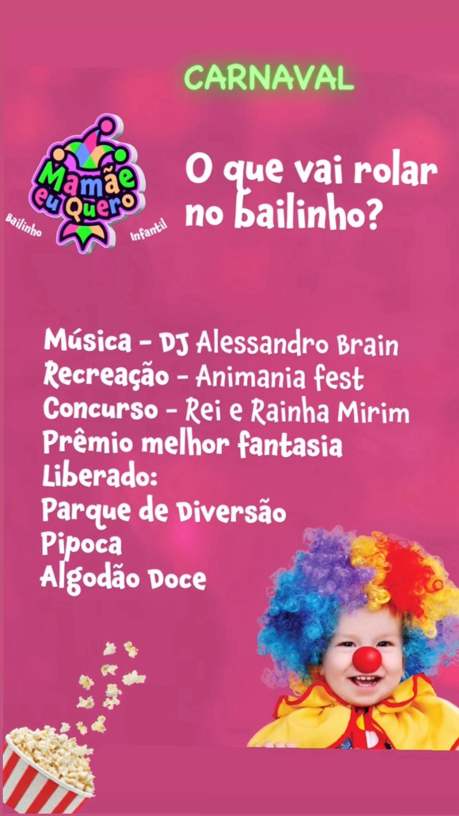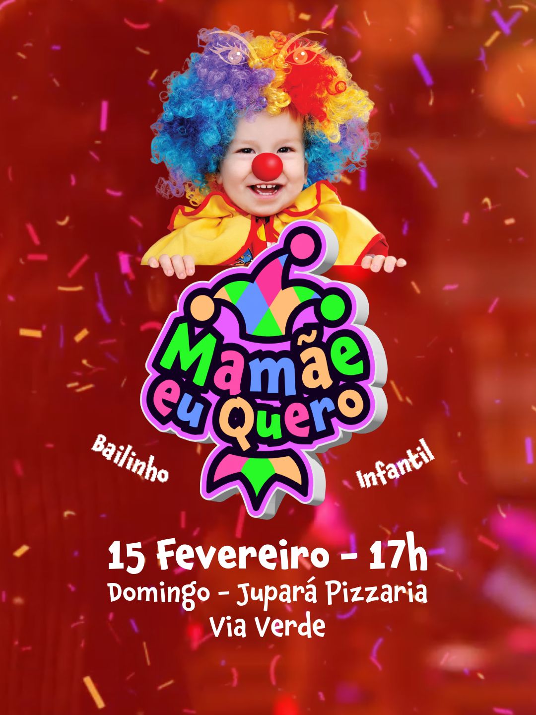 No dia 15 de fevereiro, acontece o tradicional Bailinho Infantil “Mamãe Eu Quero”, um dos eventos mais aguardados do calendário infantil. A festa é promovida pela promoter Meyre Manaus e será realizada no Jupará Pizzaria, reunindo crianças e famílias para uma tarde de muita alegria, música e diversão