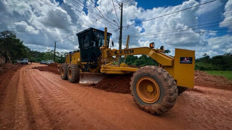 No local, as equipes atuam na terraplenagem e no reforço da base, além da implantação do sistema de drenagem e de meio-fio e sarjetas, garantindo as condições técnicas necessárias para a durabilidade da estrada.