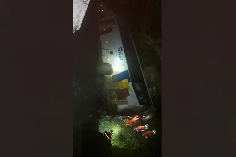 Desgovernado, ônibus de viagem cai de ponte na BR-060