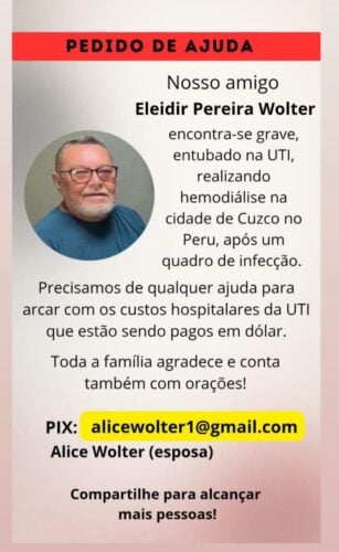 A família e amigos de Eleidir Pereira Wolter fazem um apelo por ajuda financeira e orações diante do delicado estado de saúde do paciente. Eleidir encontra-se internado em estado grave, entubado na UTI de um hospital na cidade de Cusco, no Peru, após apresentar um quadro de infecção.