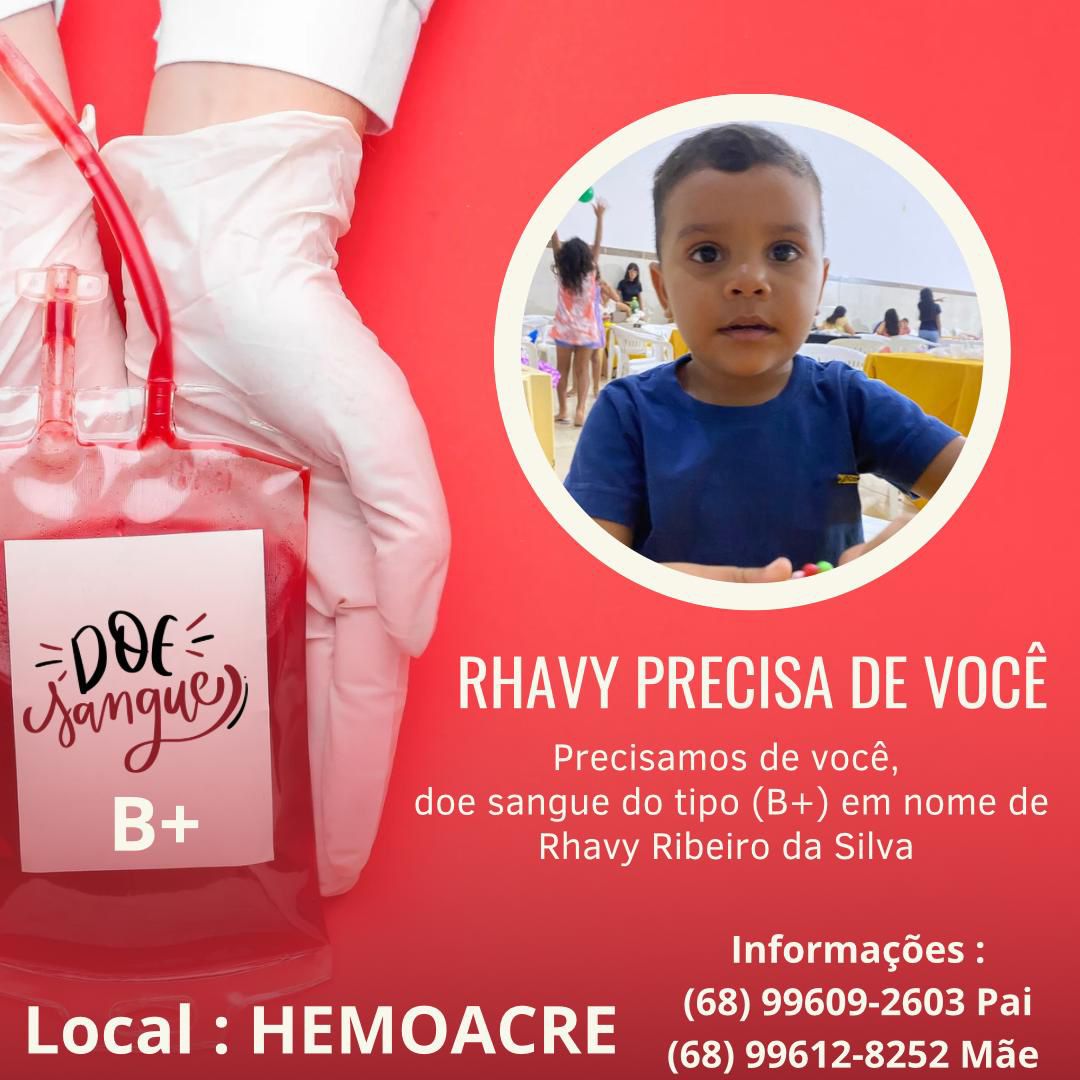 Segundo a família, o tipo de sangue necessário para o tratamento é o B+, e a doação pode ser realizada no Hemoacre da capital, em nome do pequeno Rhavy. A família é natural de Sena Madureira e está em Rio Branco para acompanhar o tratamento de saúde do garoto.