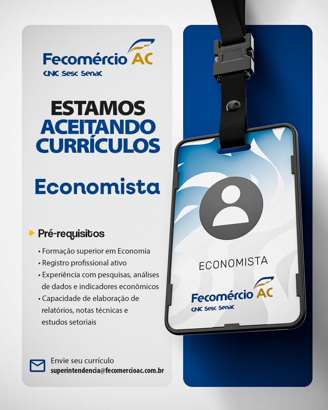 A Fecomércio AC, que integra o sistema CNC, Sesc e Senac, procura um profissional capaz de contribuir diretamente com estudos e análises econômicas voltadas ao comércio, aos serviços e ao turismo no estado. A atuação será estratégica, com foco na interpretação de cenários econômicos locais e nacionais para subsidiar decisões da Federação e orientar o planejamento do setor empresarial acreano.