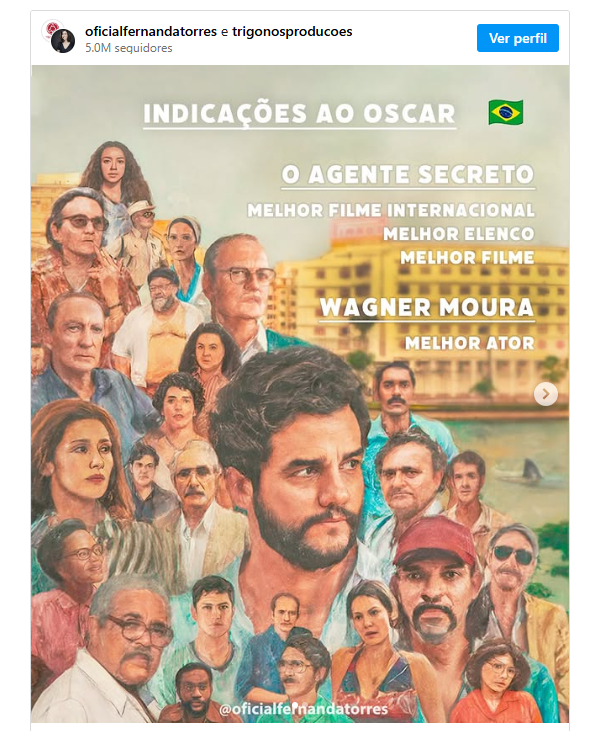 No Instagram, Fernanda compartilhou pôsteres de O Agente Secreto e Sonhos de Trem, longas que representam o Brasil na disputa deste ano. Na legenda, escreveu: “E a festa continua né, Brasil?”