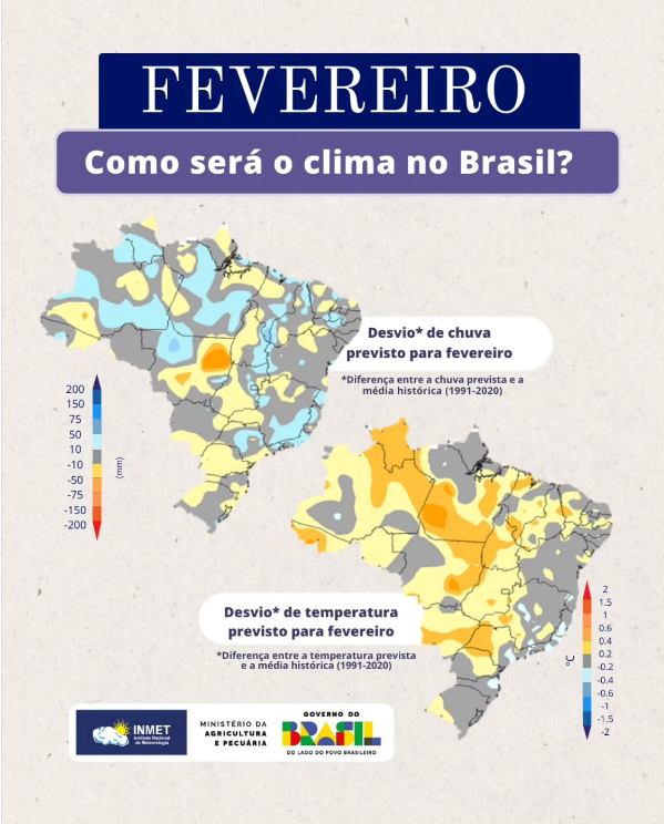 Nas demais regiões, o Inmet prevê temperaturas predominantemente acima ou próximas da média climatológica, com desvios mais significativos no Centro-Oeste. No Sul e Sudeste, os valores tendem a ficar mais próximos do esperado para fevereiro, embora algumas áreas possam registrar leve elevação térmica ao longo do mês.