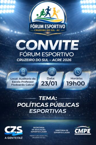 O Conselho Municipal de Políticas Esportivas de Cruzeiro do Sul está convidando conselheiros, representantes de modalidades esportivas, dirigentes, atletas e demais agentes do esporte para participarem do Fórum Esportivo, um encontro voltado ao compartilhamento de ideias e ao fortalecimento do esporte no município. O evento terá como tema central as Políticas Públicas Esportivas.