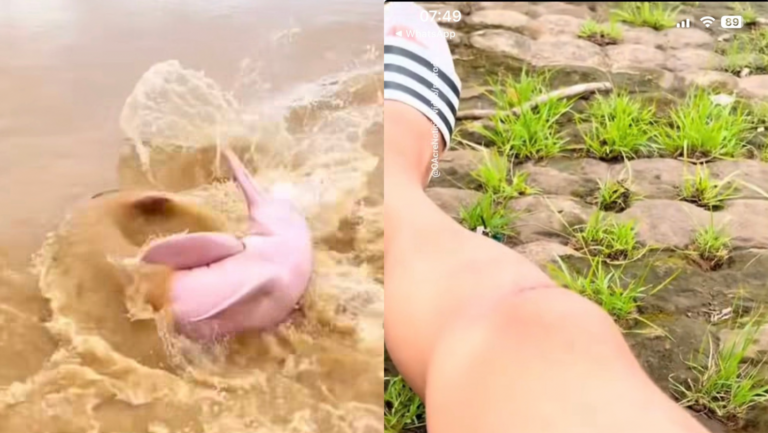 “Fui almoçar em Rio Branco e na frente do restaurante fica o Rio Acre. Eu vi um boto tentando capturar seu almoço, resolvi gravar pra vocês e ainda levei um tombo”, disse o homem no vídeo.