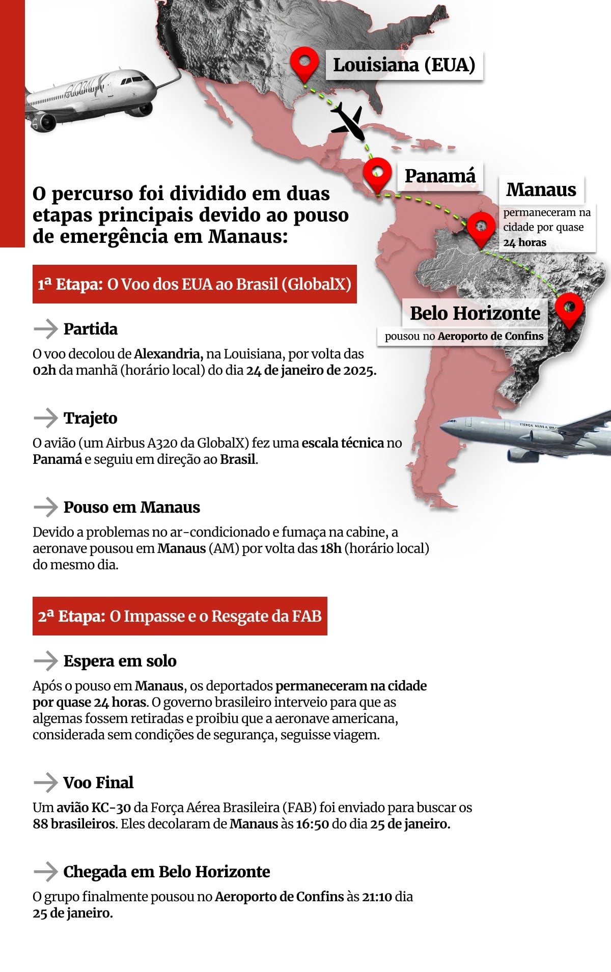Ao desembarcarem em Manaus, os brasileiros foram resgatados pelo governo, que proibiu que a aeronave norte-americana seguisse viagem. Um voo da Força Aérea Brasileira (FAB) foi usado para concluir o trajeto até Belo Horizonte, no dia 25 de janeiro de 2025.