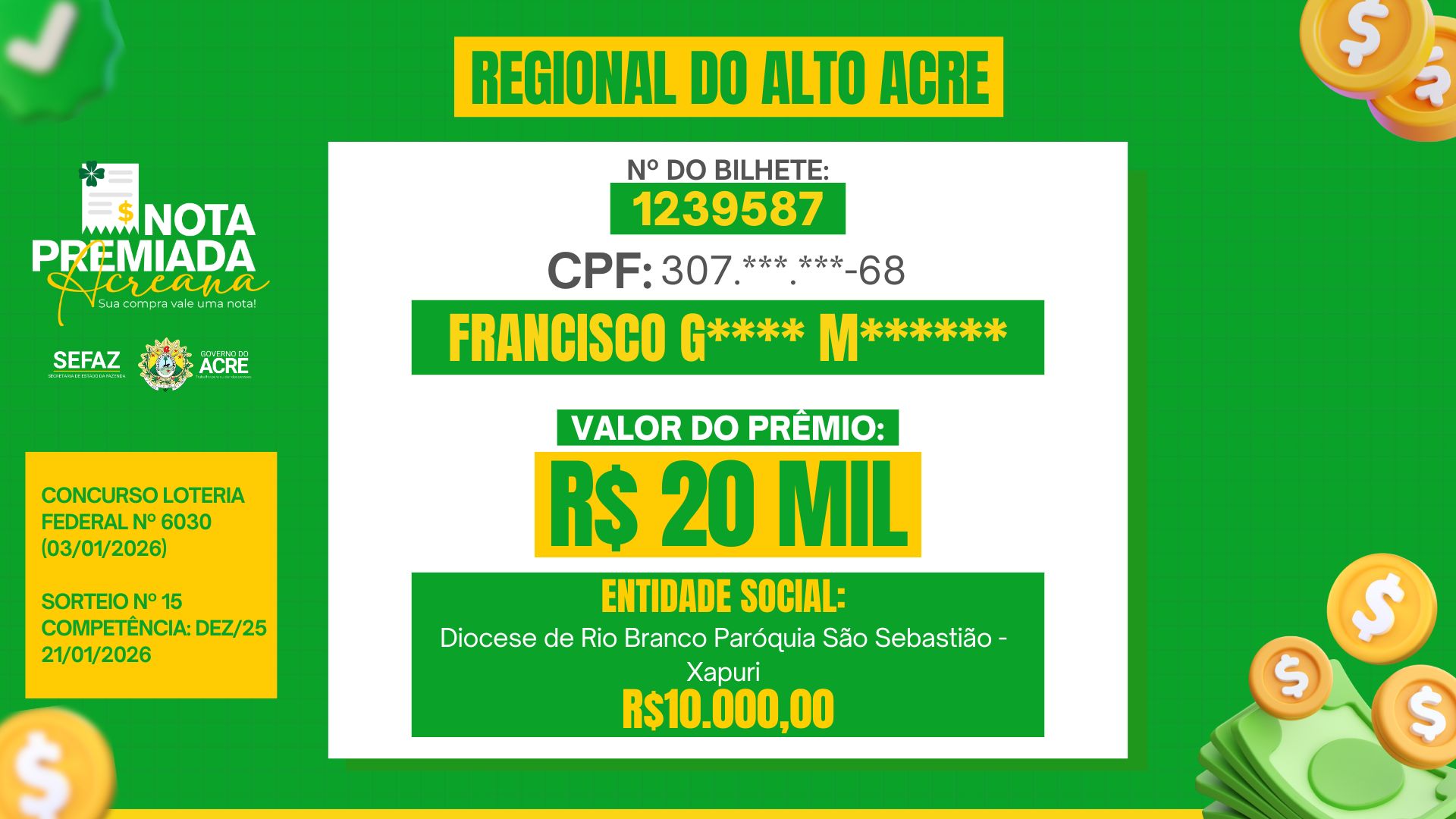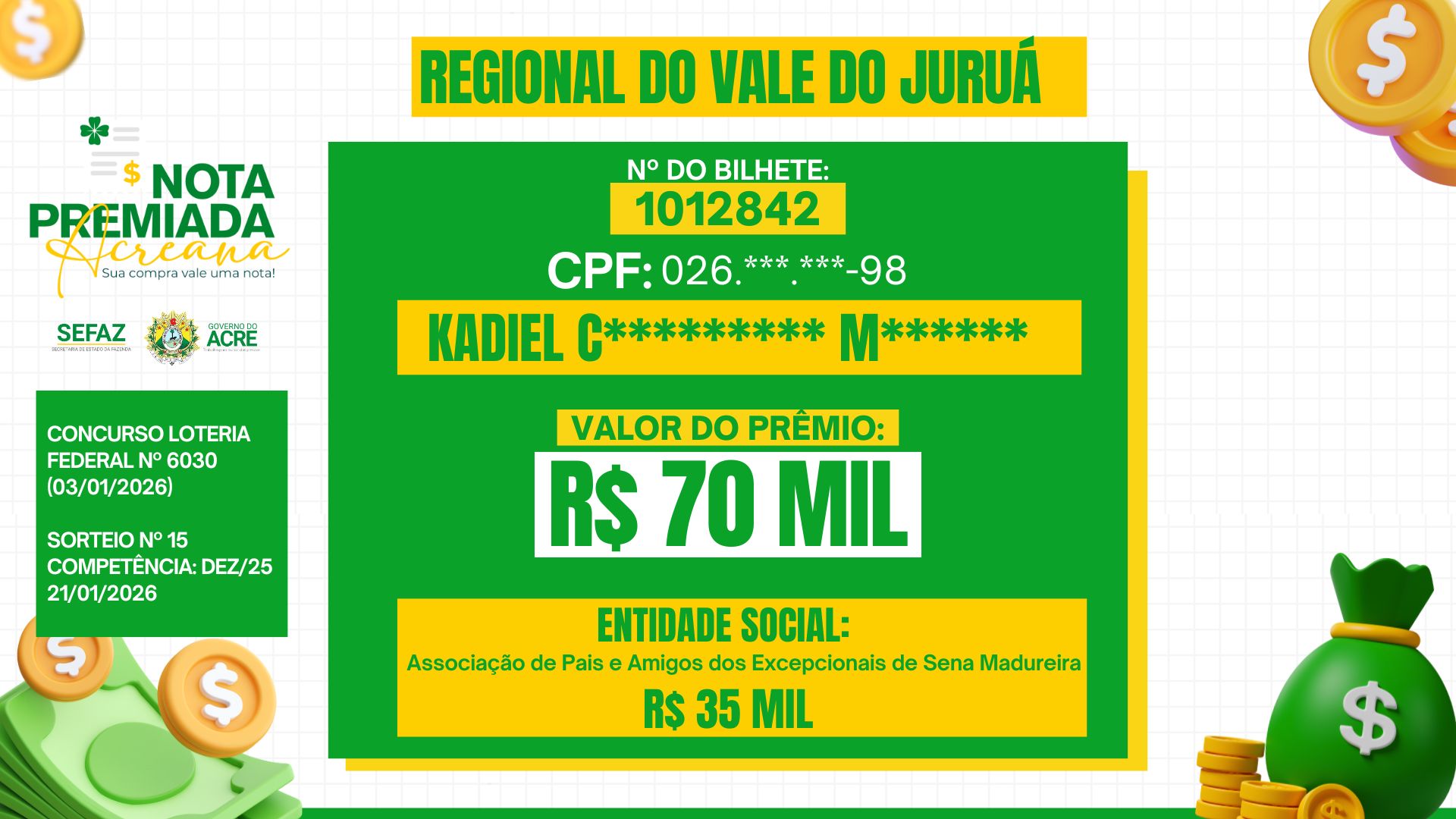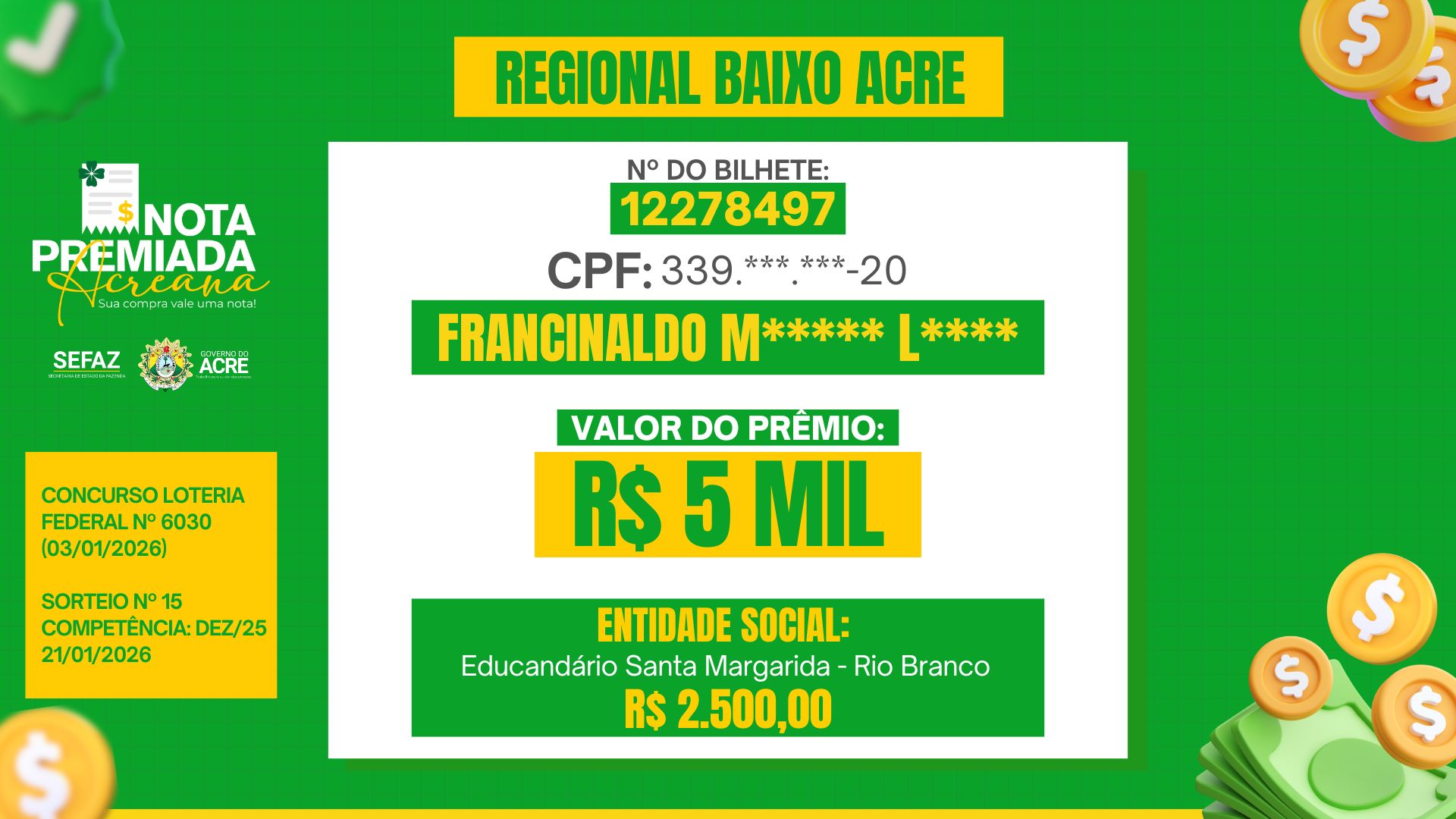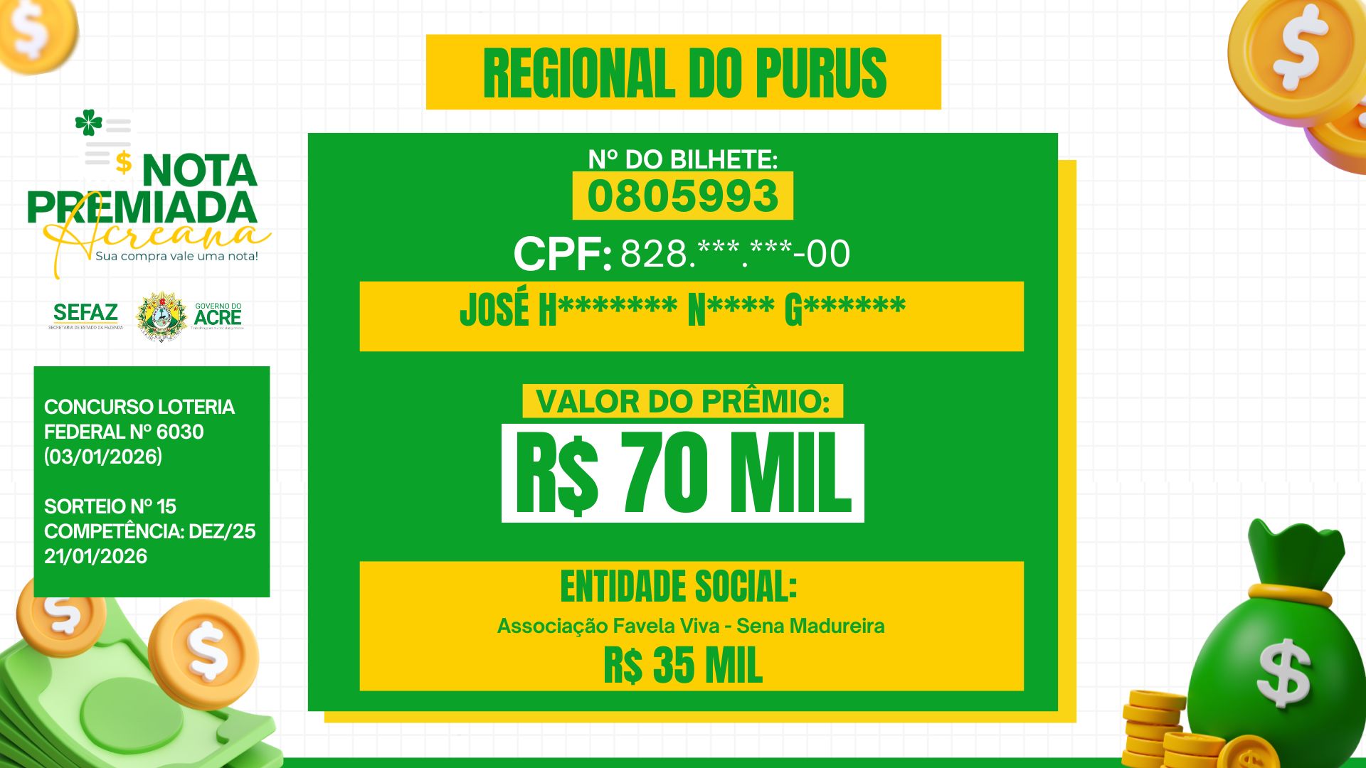 Programa de Estado coordenado pela Secretaria de Estado da Fazenda (Sefaz), o Nota Premiada Acreana incentiva os consumidores a incluírem o CPF na nota fiscal no momento da compra, transformando um hábito simples em benefícios financeiros e sociais. Além de premiar os cidadãos, o programa fortalece o trabalho de instituições sem fins lucrativos, que recebem 50% do valor do prêmio conquistado pelos participantes que as indicam.