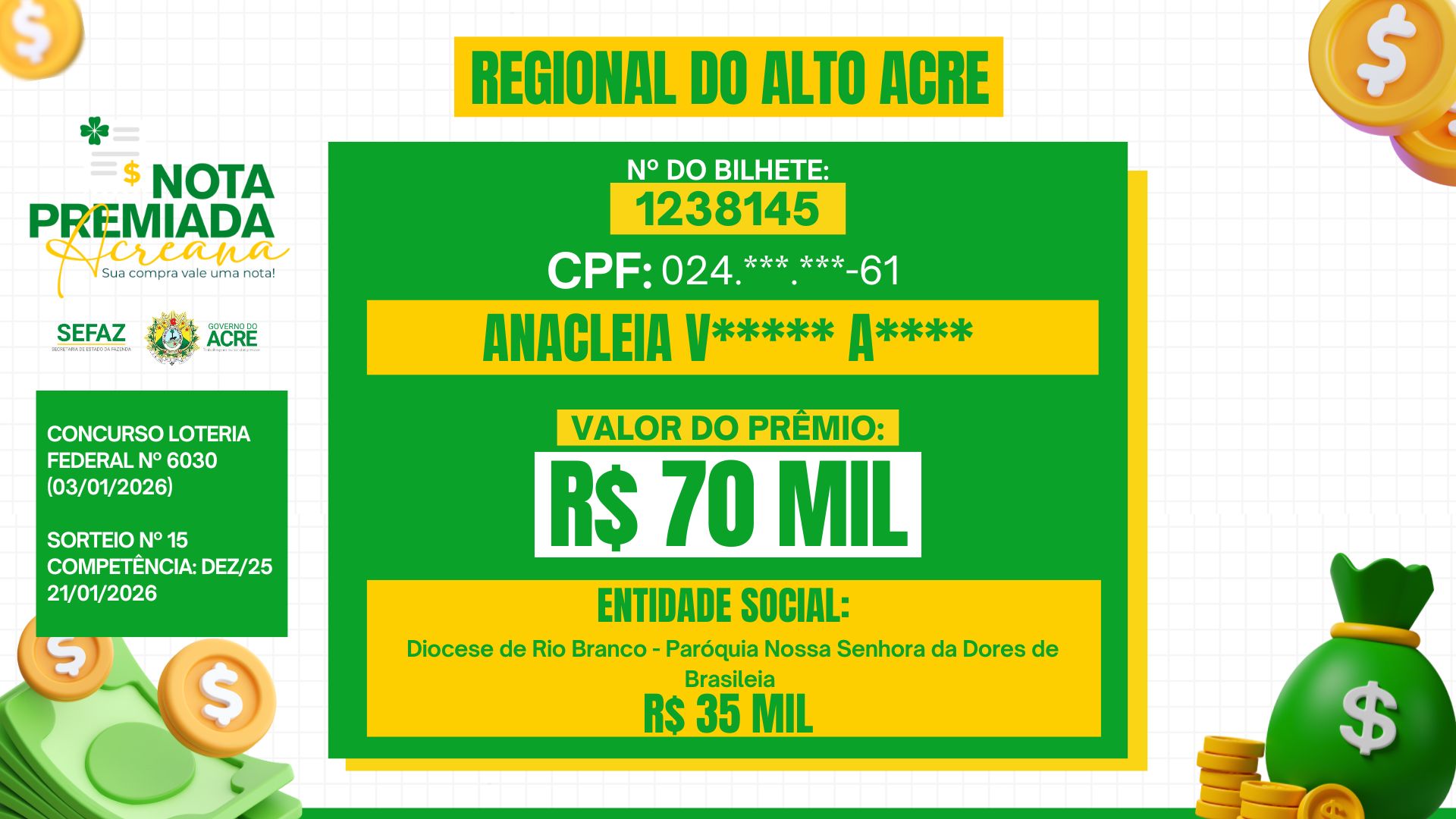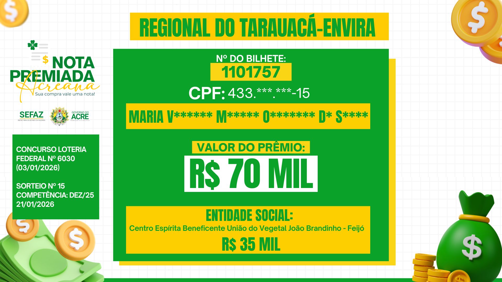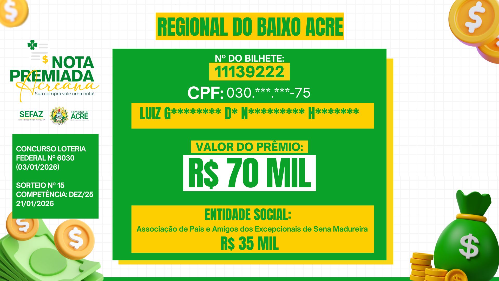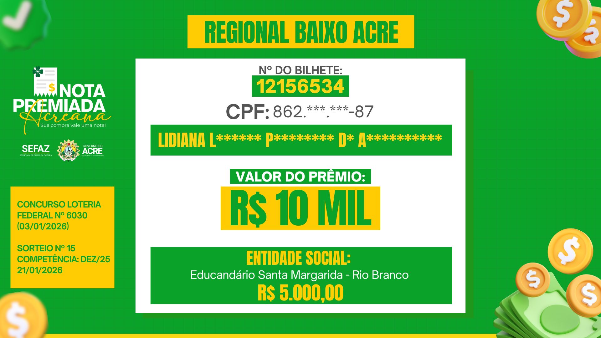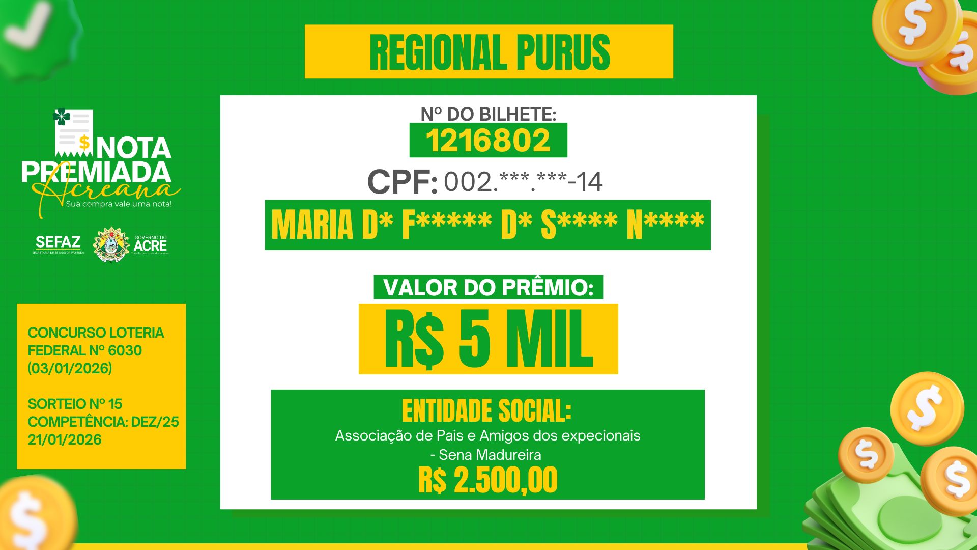 Programa de Estado coordenado pela Secretaria de Estado da Fazenda (Sefaz), o Nota Premiada Acreana incentiva os consumidores a incluírem o CPF na nota fiscal no momento da compra, transformando um hábito simples em benefícios financeiros e sociais. Além de premiar os cidadãos, o programa fortalece o trabalho de instituições sem fins lucrativos, que recebem 50% do valor do prêmio conquistado pelos participantes que as indicam.