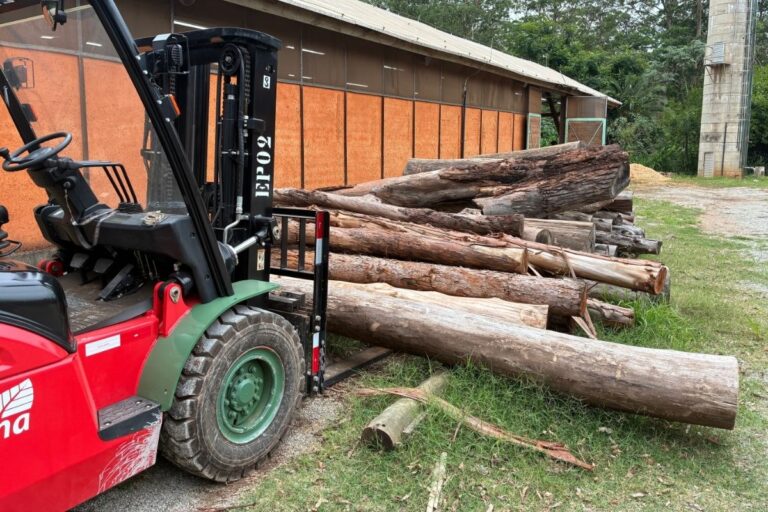 Já as toras apropriadas para a fabricação de móveis são separadas e recebem um primeiro tratamento. Chapas de alumínio evitam rachaduras