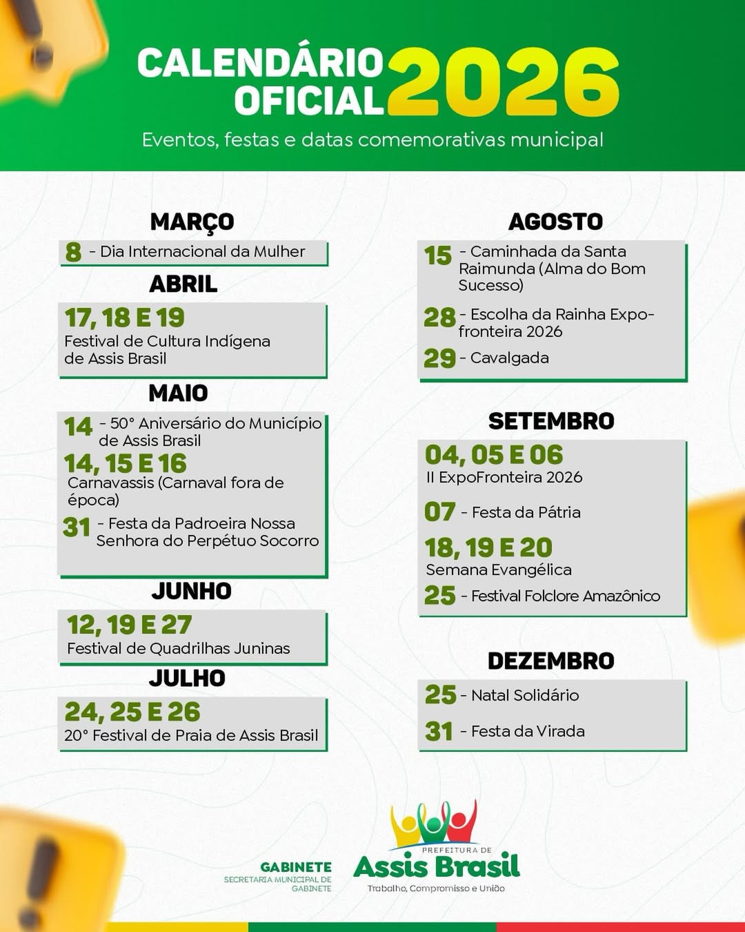 A Prefeitura de Assis Brasil já divulgou o Calendário Oficial de Eventos 2026, reunindo festas tradicionais, datas comemorativas e grandes encontros que celebram a cultura, a fé e a identidade do município.