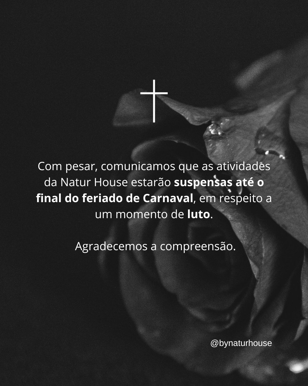 Com pesar, informamos que as atividades da Natur House estarão suspensas até o final do feriado de Carnaval, em respeito a um momento de luto.