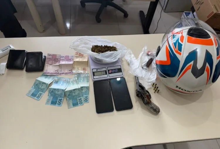 Na revista pessoal, os policiais encontraram um revólver calibre .22 na cintura do suspeito. Em seguida, durante buscas no quintal da residência, foi localizada droga do tipo skunk, o que caracterizou o crime de tráfico de entorpecentes. Também foram apreendidos a arma de fogo, a droga e a motocicleta utilizada na tentativa de fuga.
