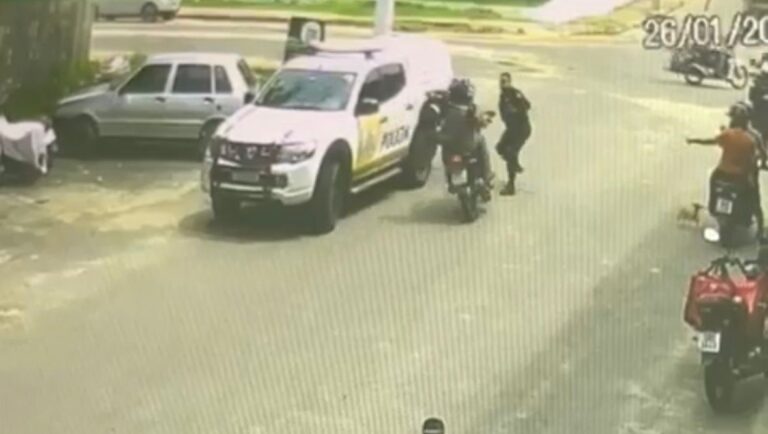 Apesar do impacto, o policial conseguiu se levantar rapidamente e deu continuidade à ocorrência. A dupla que tentou escapar perdeu o controle da motocicleta e caiu alguns metros à frente do ponto da abordagem.