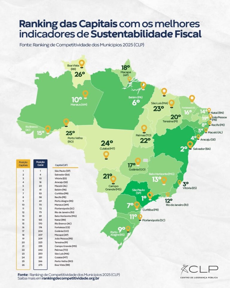 Rio Branco ocupa a 15ª posição entre as capitais brasileiras em sustentabilidade fiscal em 2025, segundo o Ranking de Competitividade dos Municípios. No recorte nacional, que inclui cidades de todo o país, a capital acreana aparece na 170ª colocação, segundo informações divulgadas ainda nesta quarta-feira (14), nas redes sociais, pelo Centro de Lideranças Públicas (CLP).