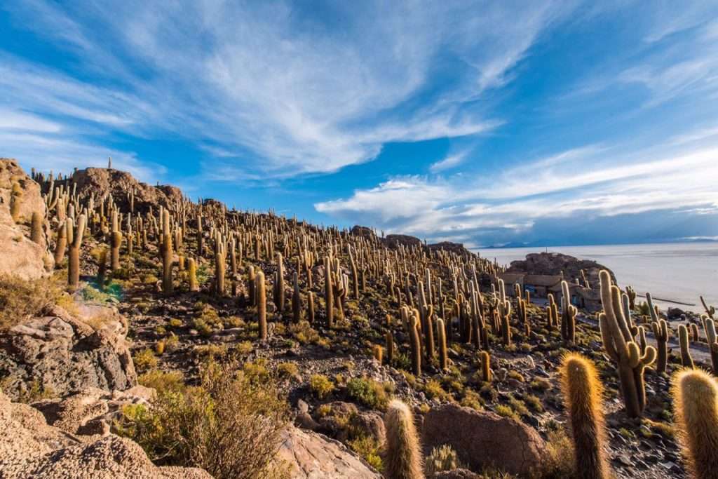 Localizada no meio do deserto de sal, a ilha é coberta por cactos gigantes e formações rochosas. Do alto, é possível ter uma das vistas mais impressionantes do salar, especialmente ao amanhecer.