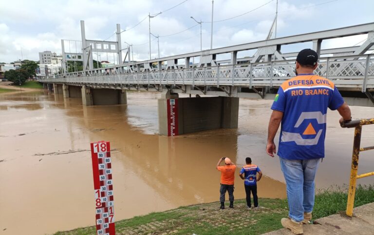 O Rio Acre ultprassou a cota de transbordo, em Rio Branco, e atingiu os 14,01 metros às 15 horas desta sexta-feira (16), segundo boletim divulgado pela Defesa Civil Municipal.