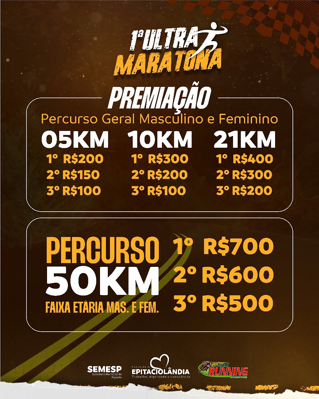A competição contará com percursos gerais masculino e feminino de 5 km, 10 km e 21 km, além do desafiador percurso de 50 km, disputado por faixa etária, também nas categorias masculina e feminina. A prova oferece mais de R$ 11 mil em premiação, valorizando e incentivando os atletas participantes.