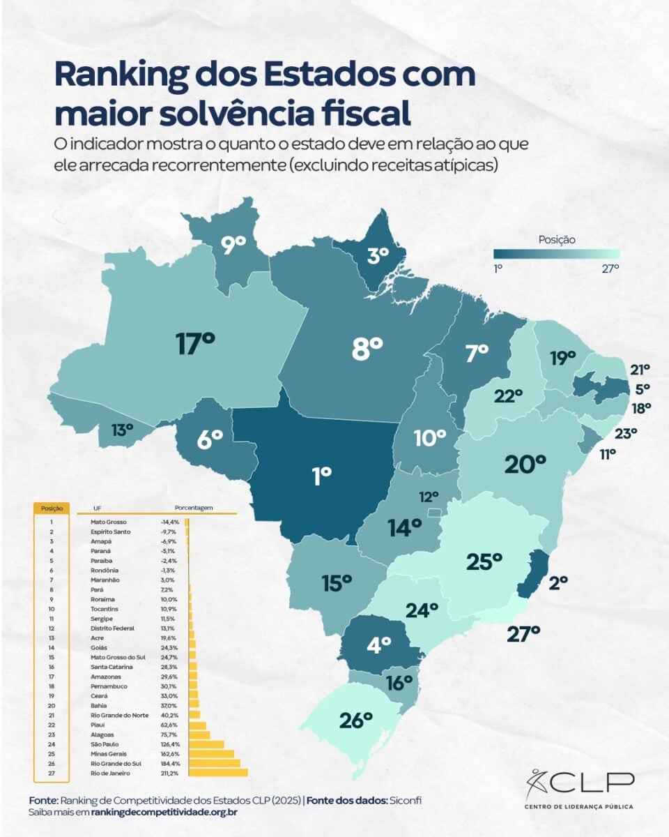 O Acre ocupa a 13ª colocação no ranking nacional de solvência fiscal entre as 27 unidades da federação. O estado registrou índice de 19,6%, conforme dados do Ranking de Competitividade dos Estados, elaborado com base em pesquisa técnica da Tendências Consultoria. As informações foram divulgadas nesta quinta-feira (26), nas redes sociais do Centro de Lideranças Públicas (CLP)