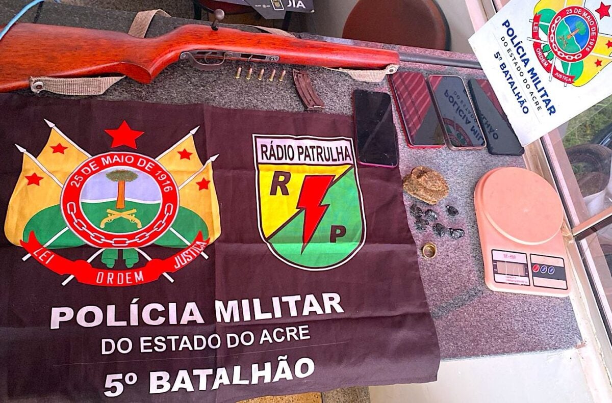 Dentro da residência, os policiais apreenderam um rifle calibre .22 acompanhado de munições, além de três outras barras de maconha — totalizando cerca de 42 gramas da droga —, seis papelotes de cocaína, uma balança de precisão e quatro aparelhos celulares.