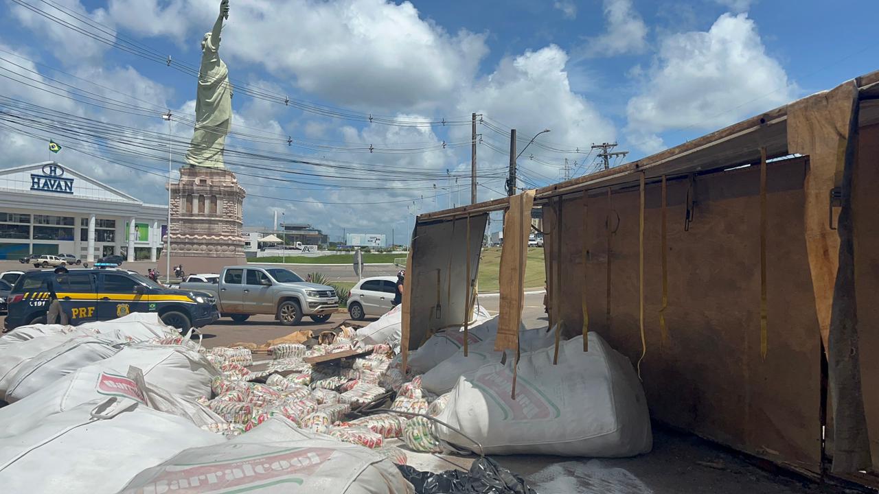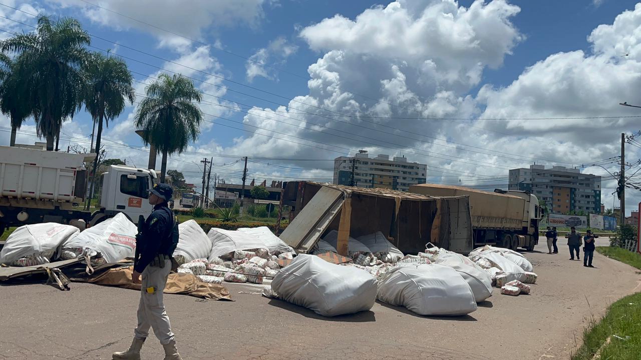 O segundo compartimento de uma carreta bitrem tombou na manhã desta terça-feira (3) na rotatória da Havan, localizada na BR-364, no bairro Portal da Amazônia, em Rio Branco.