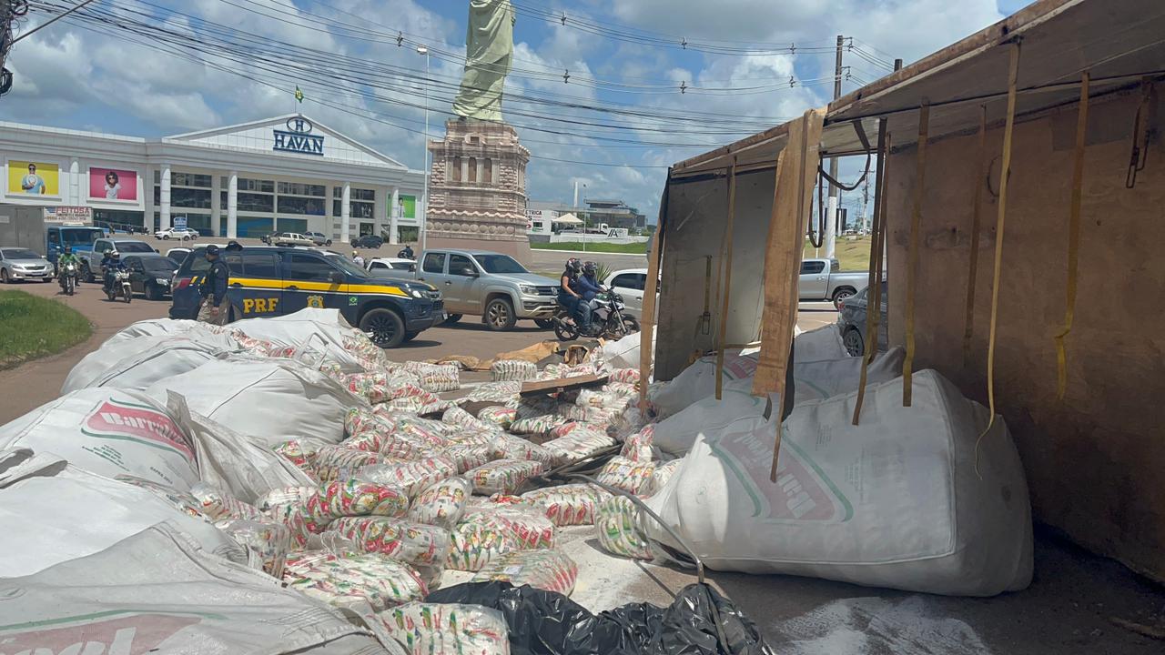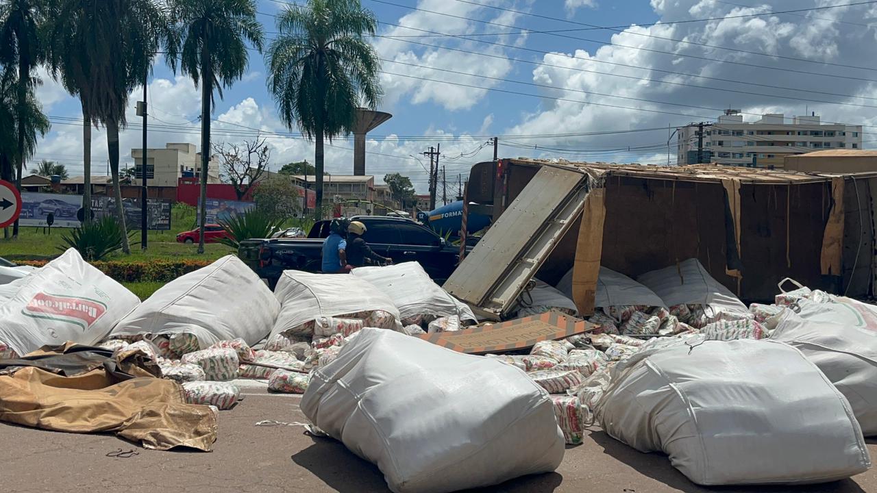 De acordo com informações repassadas pelo condutor do veículo, ele seguia no sentido centro–bairro transportando uma carga de açúcar quando, ao acessar a rotatória, o segundo compartimento da carreta acabou tombando. Com o impacto, parte do asfalto foi danificada e aproximadamente três toneladas do produto ficaram espalhadas sobre a pista.