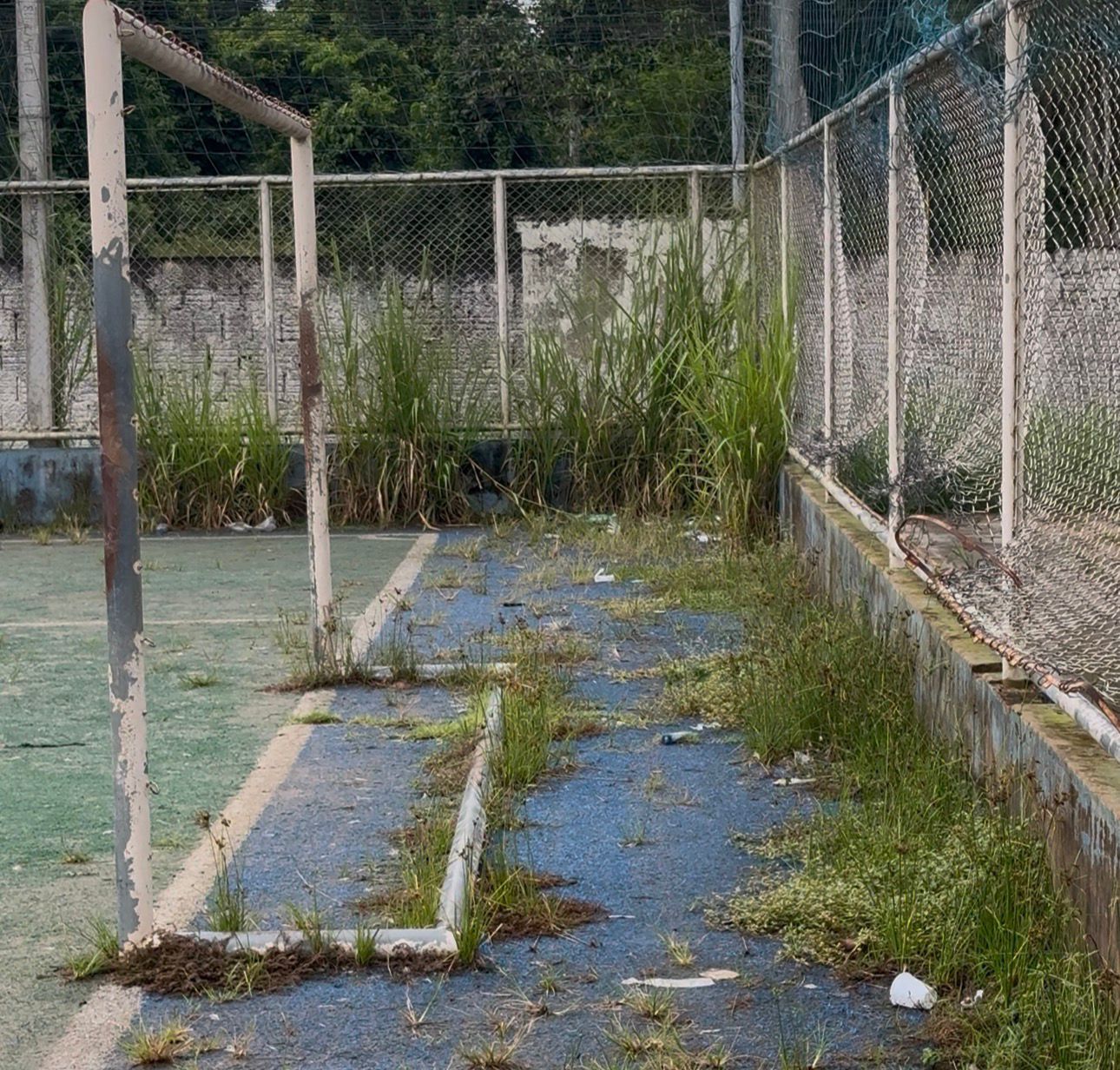 Nos registros, é possível observar o mato tomando conta das áreas internas das quadras, buracos no piso sintético, telas de proteção danificadas pela ferrugem e traves comprometidas pelo desgaste do tempo. O cenário evidencia a falta de cuidados básicos e transforma locais que deveriam ser de incentivo ao esporte em ambientes inseguros para os usuários. O município dispõe atualmente de apenas três quadras de grama sintética, todas em condições consideradas precárias. As mais afetadas estão localizadas em anexo ao Estádio Marreirão e no bairro Pista, áreas bastante utilizadas por jovens, crianças e desportistas. Mesmo diante dos riscos, os espaços continuam sendo utilizados diariamente, por falta de outras opções.