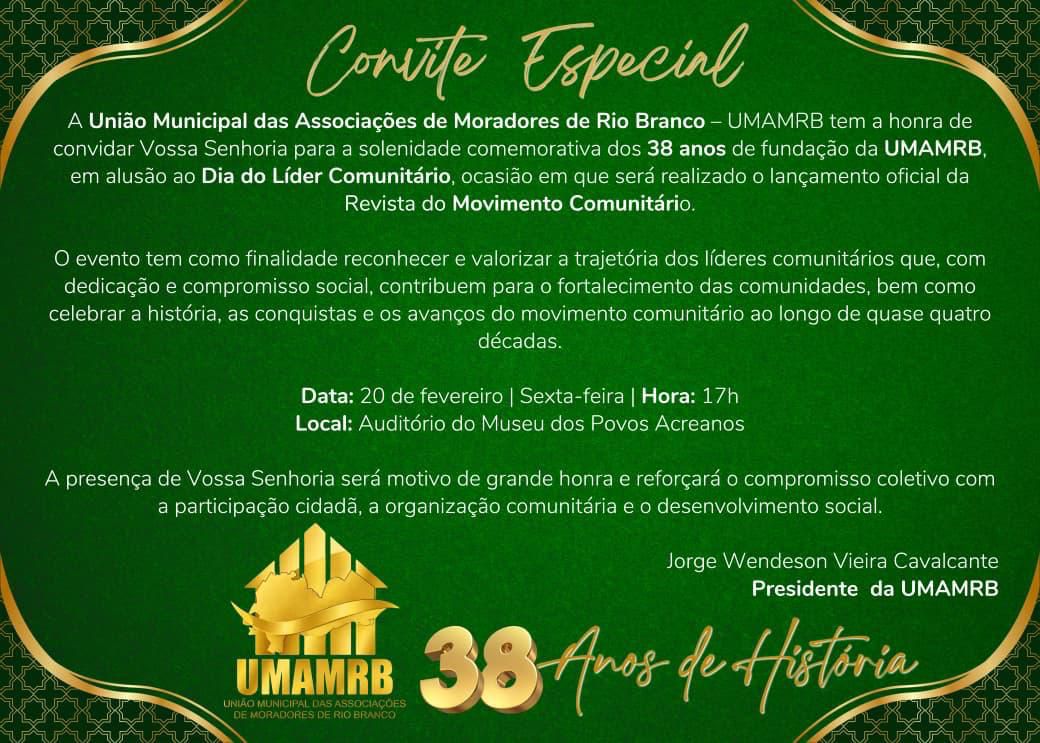 A União Municipal das Associações de Moradores de Rio Branco (UMAMRB) celebra 38 anos de história. Nesta sexta-feira (20), a UMAMRB realiza uma solenidade comemorativa da fundação da associação, em alusão ao Dia do Líder Comunitário.