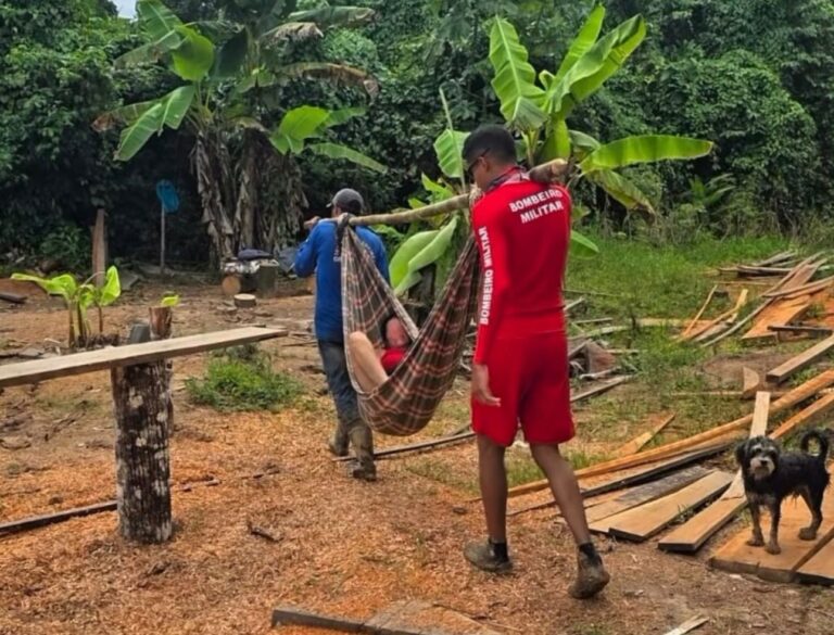 Devido às fortes chuvas que deixaram o acesso por terra comprometido, o resgate precisou ser realizado por via fluvial. Os bombeiros navegaram até a localidade e encontraram a vítima consciente, porém com ferimentos que exigiam cuidados. Para garantir a retirada com segurança, a mulher foi transportada em uma rede até a margem do rio, em um deslocamento que durou cerca de duas horas.