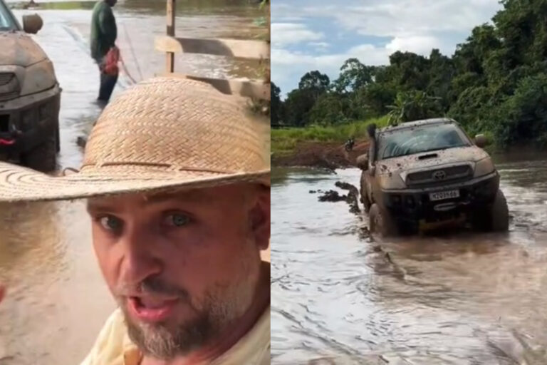 Um vídeo publicado no TikTok pelo usuário Carlos Gotardo mostra o momento em que uma caminhonete quase fica atolada ao tentar atravessar a ponte sobre o Rio Antimary, em área de floresta no interior do Acre. A gravação, feita dentro do próprio veículo, registra o susto, a tensão e a mobilização para retirar o carro de um buraco na cabeceira da estrutura. A publicação é desta segunda-feira (23).
