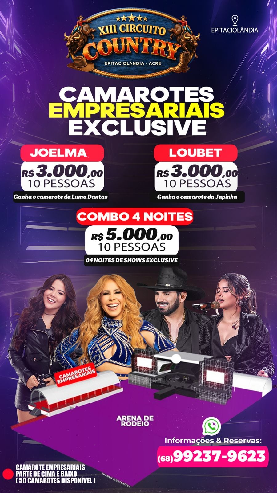 Epitaciolândia já respira clima de festa com a chegada do XIII Circuito Country, que promete noites de muita música, glamour e grandes encontros na arena de rodeio. O evento traz a opção de Camarotes Empresariais Exclusive, pensados para quem busca conforto, exclusividade e uma experiência diferenciada.