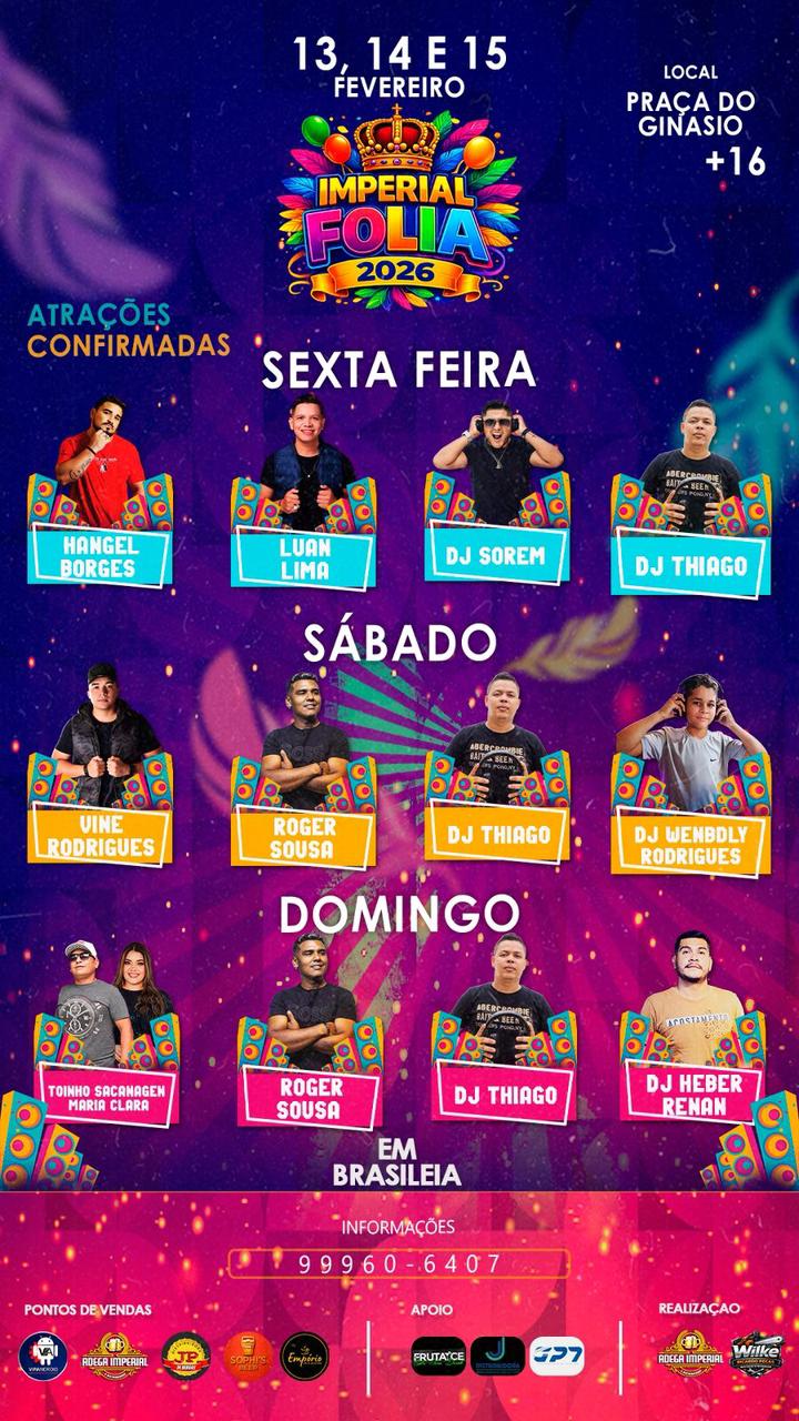 O Imperial Folia tem início nesta sexta-feira, dia 13, e segue até o domingo, dia 15, prometendo três noites de muita animação, música e diversão para o público. A programação inclui diversas atrações musicais ao longo do evento, além da tradicional matinê no domingo (15), voltada para toda a família.
