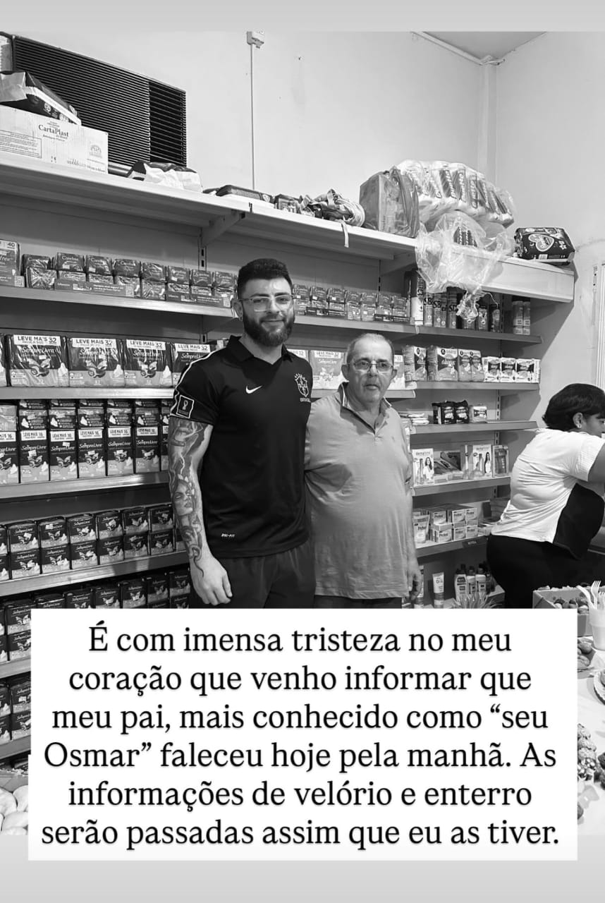 Na publicação, Lucas escreve: “É com imensa tristeza no meu coração que venho informar que meu pai, mais conhecido como “seu Osmar” faleceu hoje pela manhã. As informações de velório e enterro serão passadas assim que eu as tiver”.