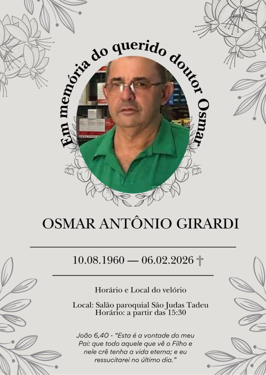 Conhecido pela cordialidade e pelo atendimento sempre atencioso, Osmar Girardi era muito querido por clientes, amigos e moradores do Conjunto Universitário. Ao longo dos anos, construiu laços de amizade com a comunidade, sendo lembrado pela simplicidade, disposição em ajudar e pelo carinho com que tratava todos que passavam por sua farmácia.