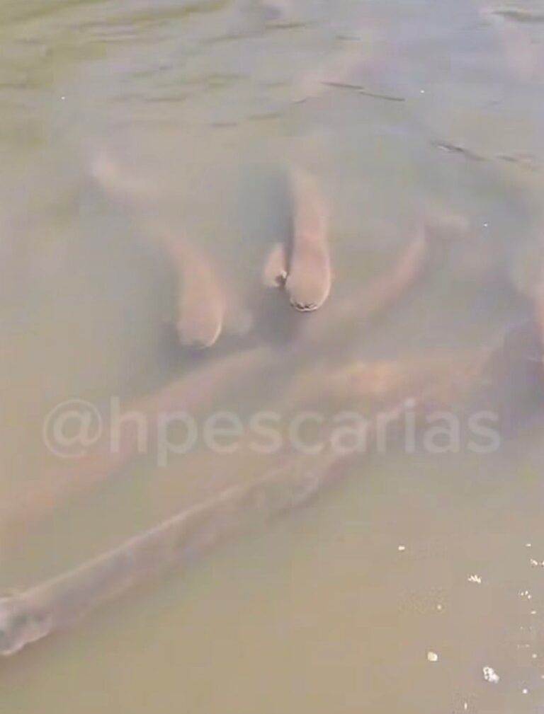 Enquanto faz a brincadeira, ele mostra o rio logo atrás. O detalhe que mais chamou atenção dos internautas, no entanto, foi a grande quantidade de poraquês visíveis na água.