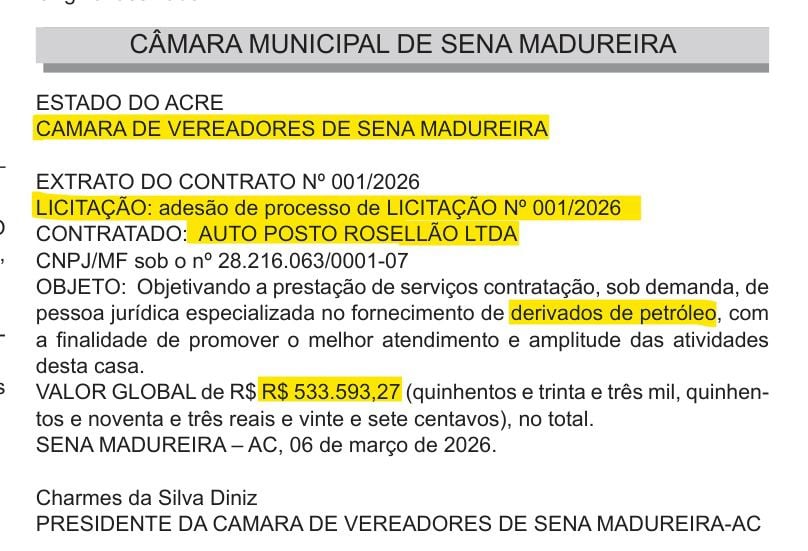 A Câmara Municipal de Sena Madureira firmou um contrato no valor global de R$ 533.593,27 para a prestação de serviços de fornecimento de derivados de petróleo. As informações constam no extrato do Contrato nº 001/2026, publicado oficialmente pela Casa Legislativa.