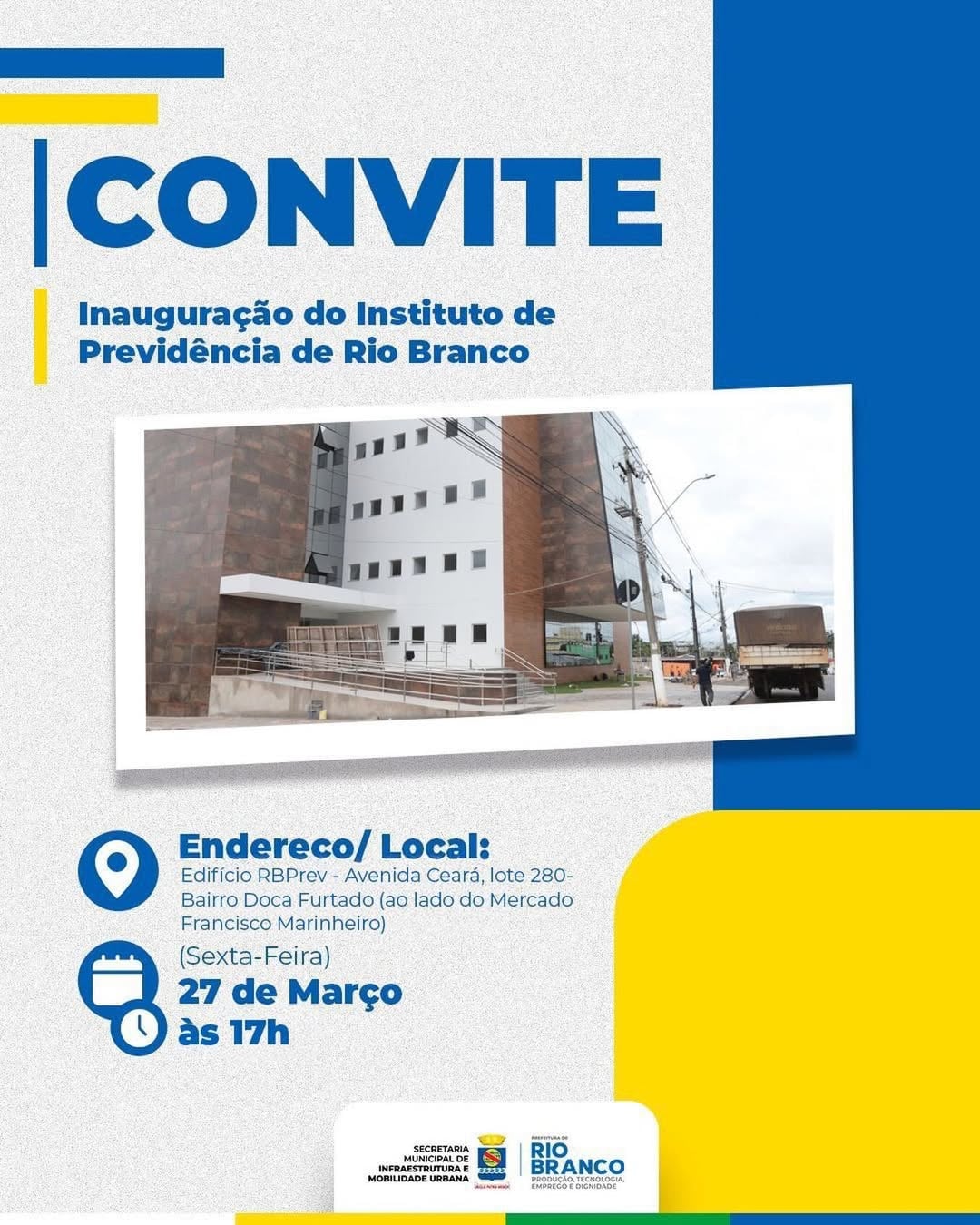 A Prefeitura de Rio Branco anunciou a data de inauguração do novo prédio do Instituto de Previdência de Rio Branco (RBPREV), localizado no bairro Estação Experimental. O prédio, que vai ser entregue na sexta-feira (27), às 17h, foi construído com recursos próprios do município e recebeu investimento de, aproximadamente, R$ 14 milhões.