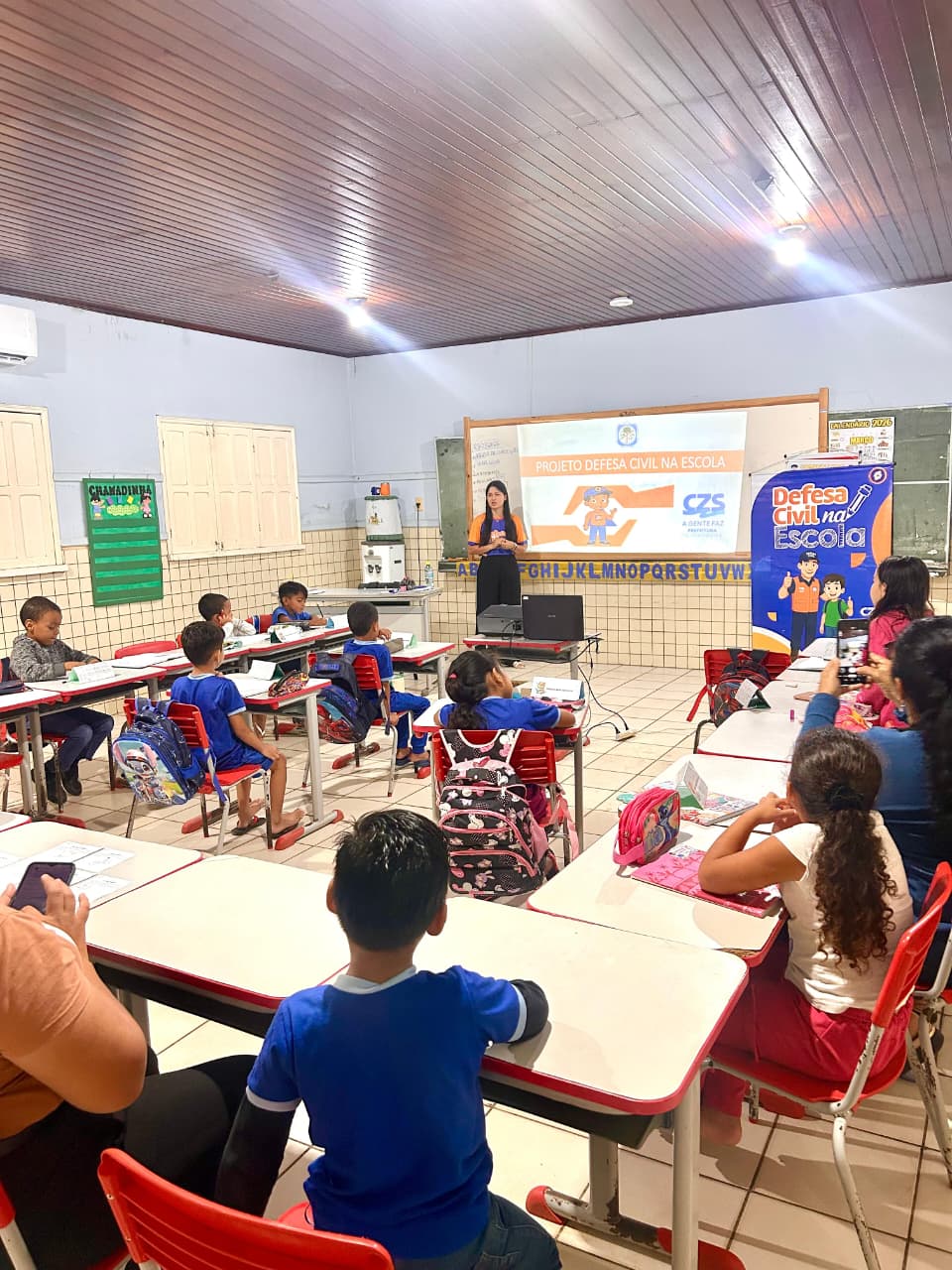 A equipe da Dedesa Civil abordou temas como “Prevenção de acidentes domésticos”, com foco no reconhecimento precoce de situações de risco e na adoção de comportamentos seguros em casos de emergência.
