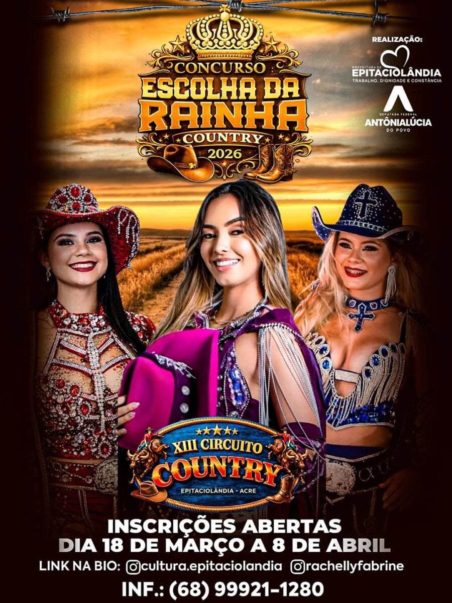 Epitaciolândia já entra no clima de festa e elegância com a chegada de um dos eventos mais aguardados da temporada: o Concurso Escolha da Rainha Country 2026! Um verdadeiro espetáculo que promete reunir beleza, atitude e o autêntico espírito country em uma celebração inesquecível.