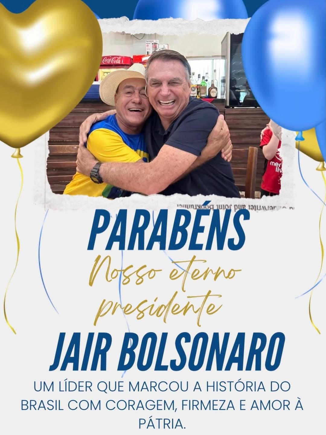 “Hoje é dia de parabenizar um homem que marcou a história do nosso país com coragem, posicionamento e amor pelo Brasil: o nosso eterno presidente @jairmessiasbolsonaro. Um líder que nunca se escondeu diante dos desafios, que enfrentou batalhas difíceis e sempre colocou Deus, pátria, família e liberdade como princípios inegociáveis, e exatamente por isso é tão perseguido.”, escreveu Bocalom.