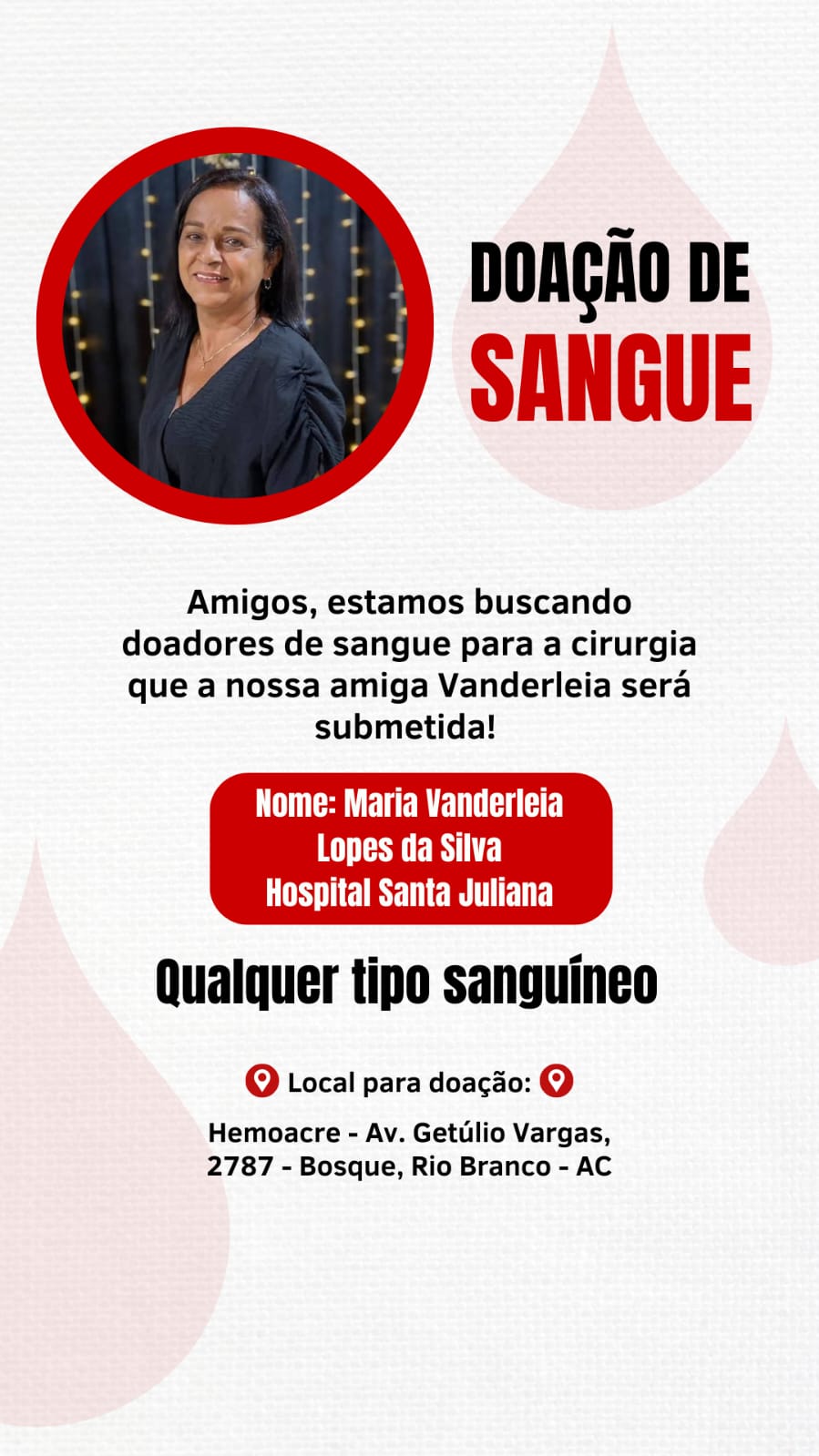 Familiares e amigos iniciaram uma campanha solidária para incentivar a doação de sangue em apoio à paciente Maria Vanderleia Lopes da Silva, que deverá passar por um procedimento cirúrgico nos próximos dias em Rio Branco. O apelo foi divulgado nas redes sociais com o objetivo de mobilizar voluntários e reforçar os estoques do hemocentro da capital acreana.