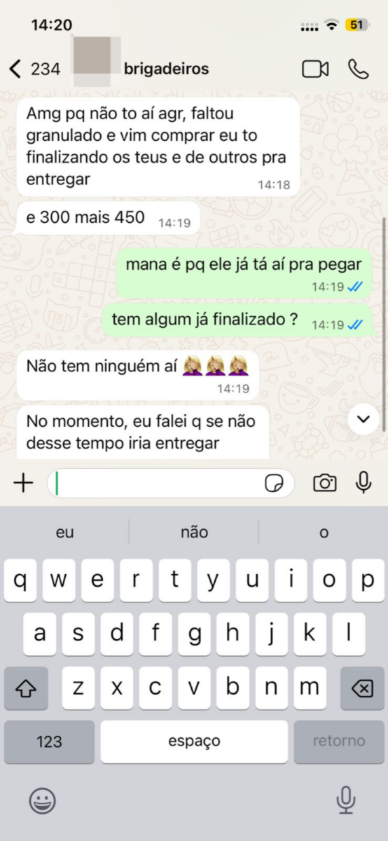 Ainda segundo o relato, os doces só teriam sido entregues por volta das 20h, quando a festa infantil já estava em andamento, e feitos por uma outra doceira. Segundo o pai, familiares foram até a casa da confeiteira, pegaram as forminhas personalizadas, e levaram para uma outra profissional. “Ela conseguiu fazer o impossível, que foi entregar esses doces ainda no mesmo dia. Foram 300 brigadeiros”.